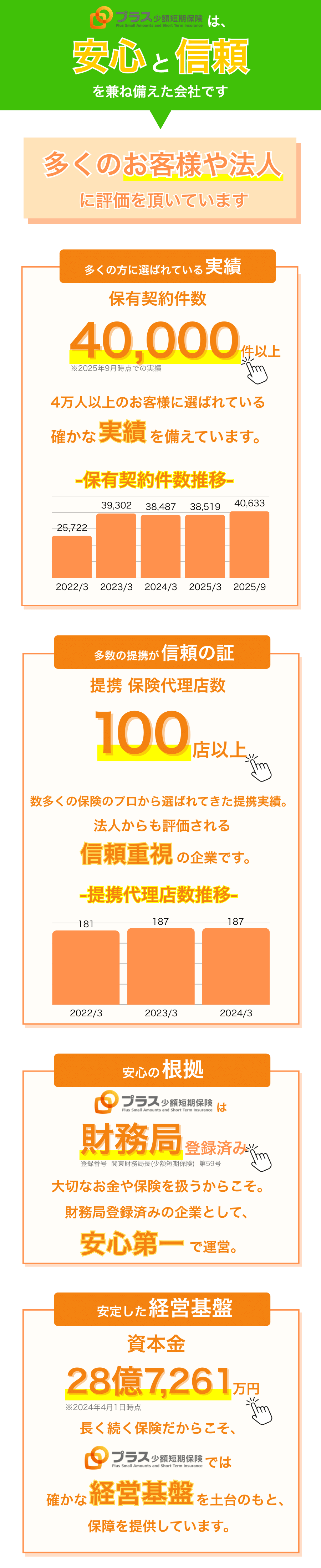 取扱代理店の少額短期保険募集人は、お客様とプラス少額短期保険との保険契約締結の媒介を行う者で、保険契約締結の代理権、告知受領権及び保険料受領権はありません。 保険契約は、お客様からの保険契約のお申し込みに対してプラス少額短期保険が承諾したときに有効に成立します。